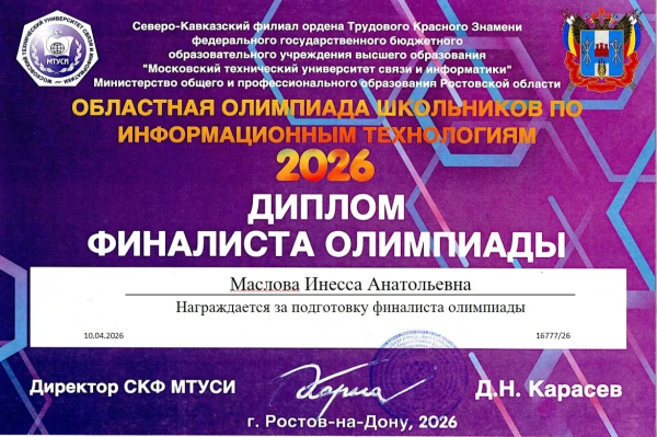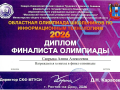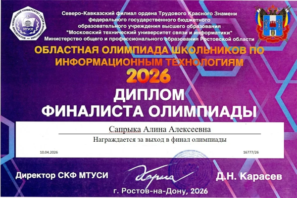 10 апреля 2026 года ученица 11 класса Сапрыка Алина вошла в число двухсот финалистов областной олимпиады школьников по информационным технологиям.